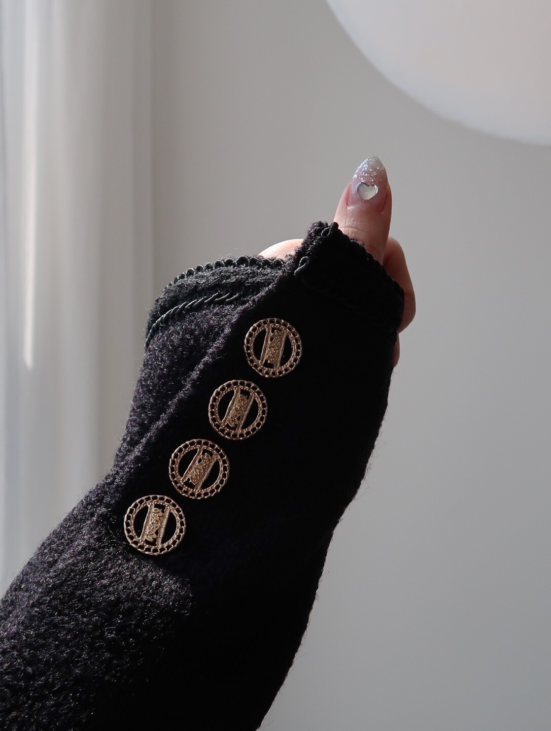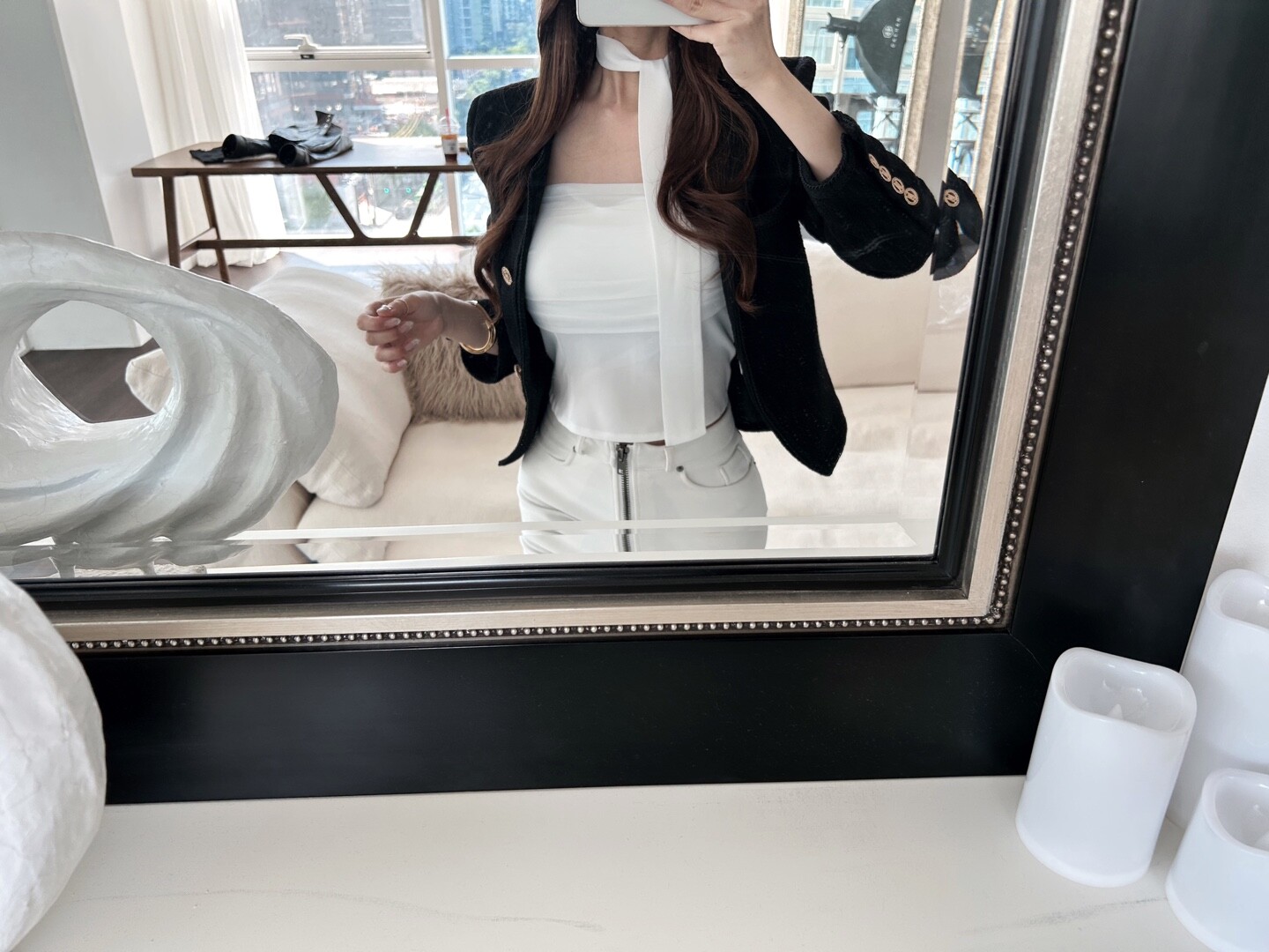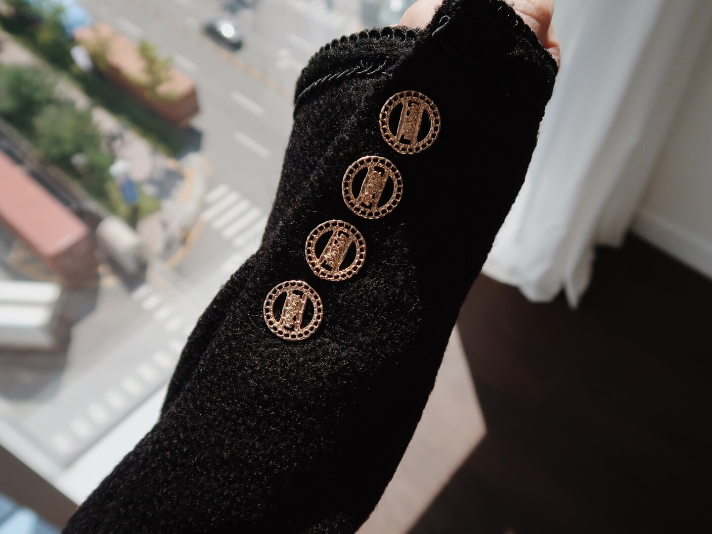 전면 넥라인과 소매 끝라인 바스트 중앙으로 디테일 포인트를 주었으며, 고급스러운 단추로 더욱 분위기를 살려주었어요.