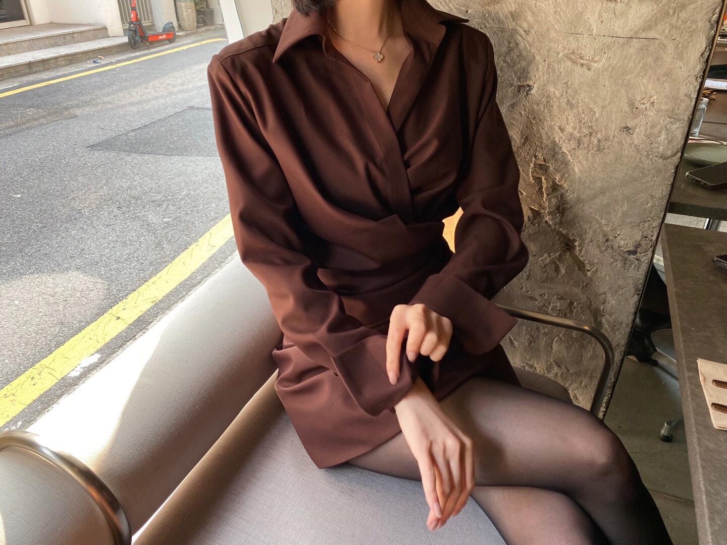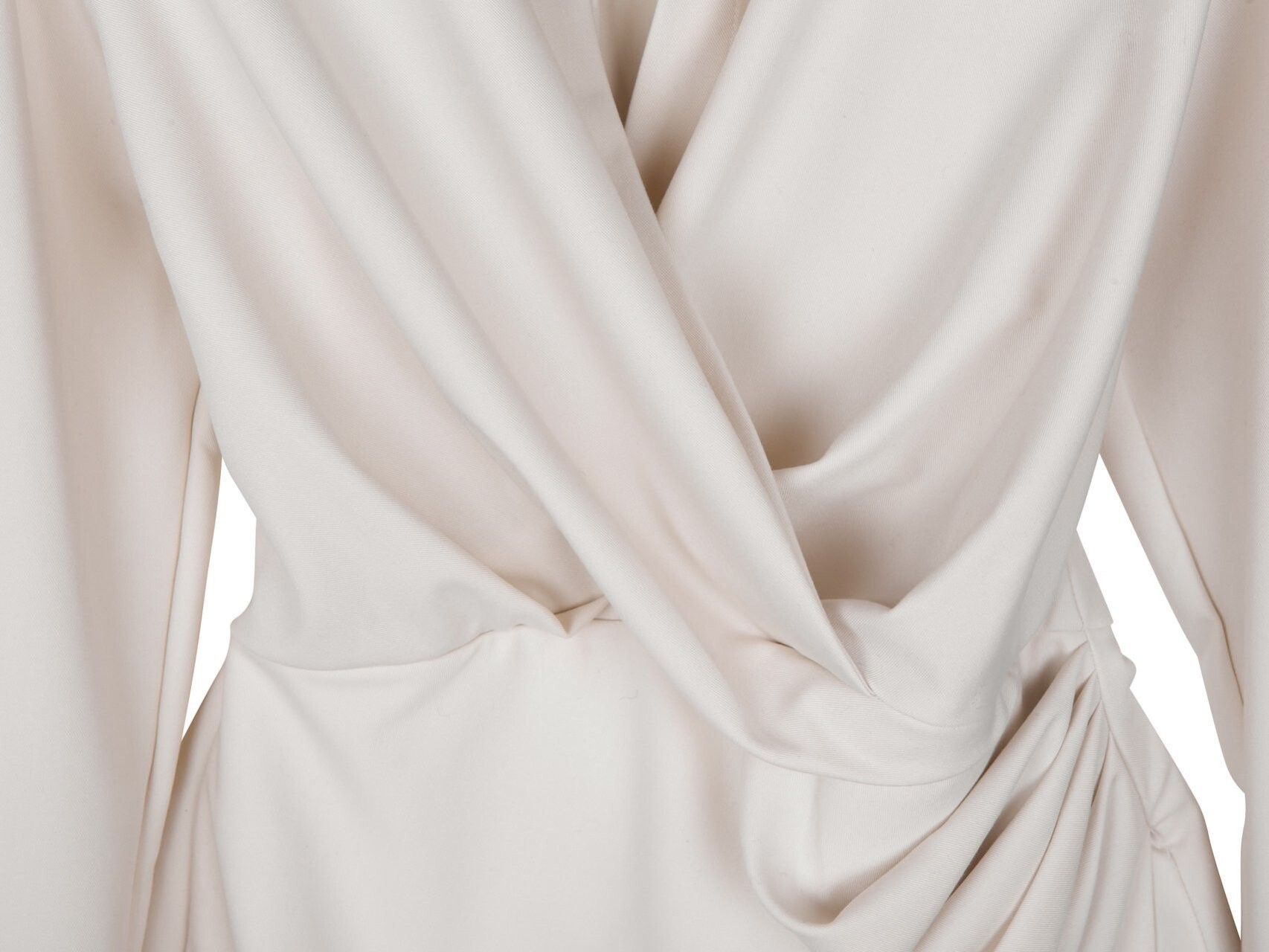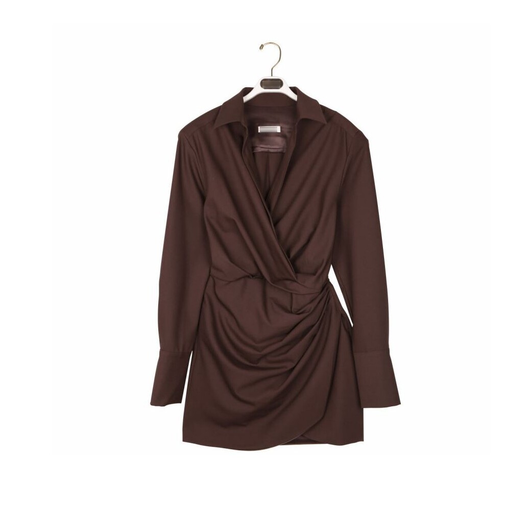 바디를 따라 흐르는 절제된 네크라인과 맥시한 기장의 슬리브 라인 그리고 드레이프 되면서 래핑 되는 밑단 디테일이 내추럴하게 여성스러움을 살려주어요.