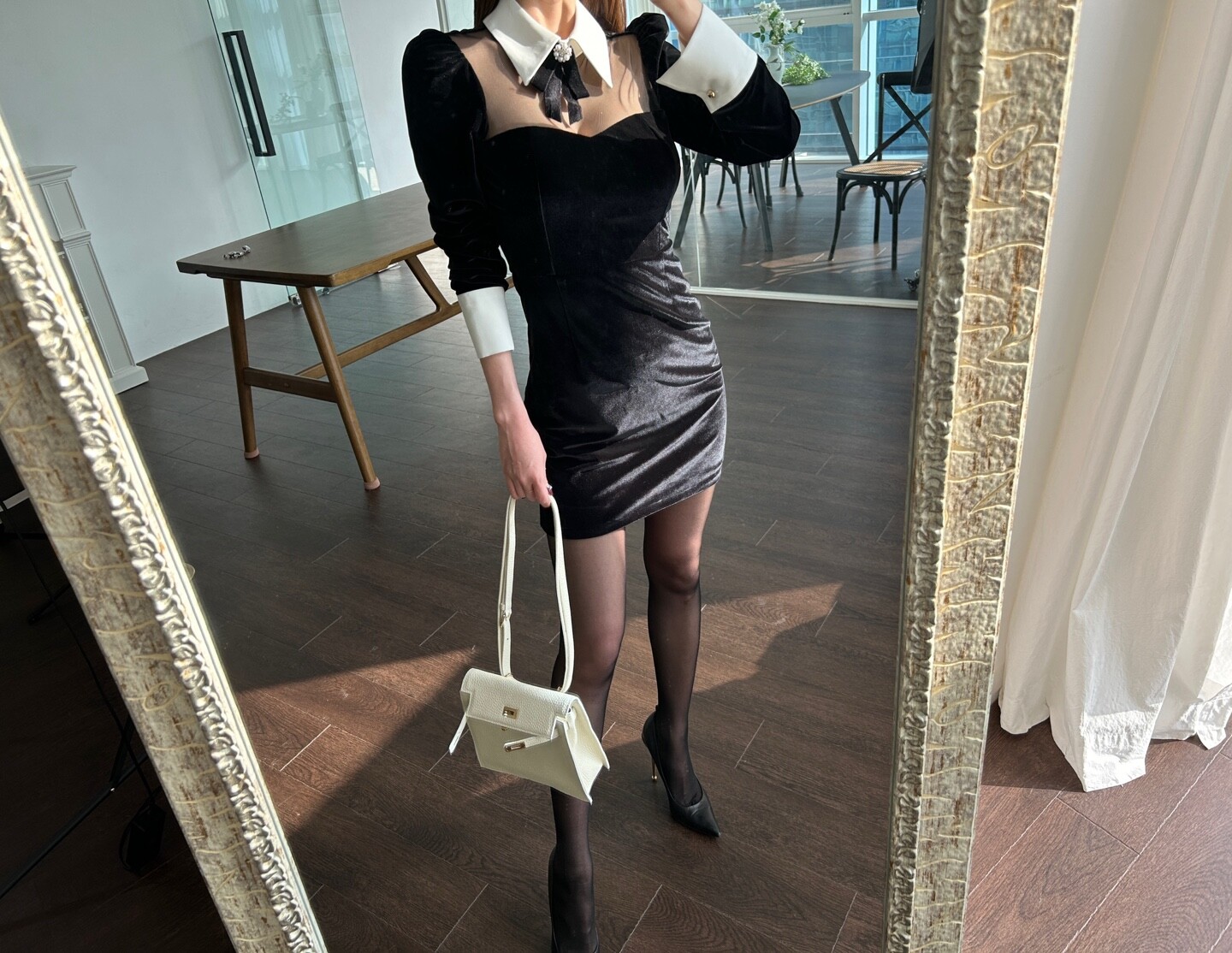 메쉬 부분이 부담스럽지 않아 격식있는 자리 , 하객룩 데이트룩으로 모두 손색없더라구요