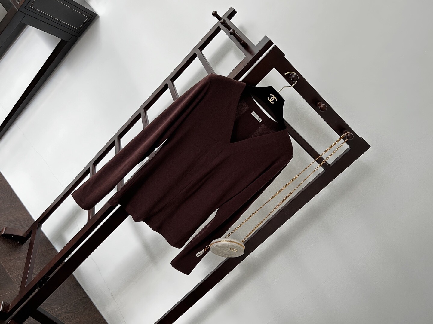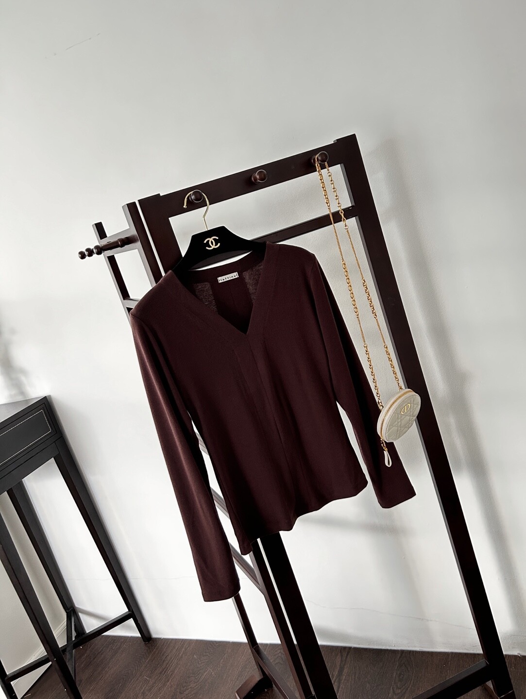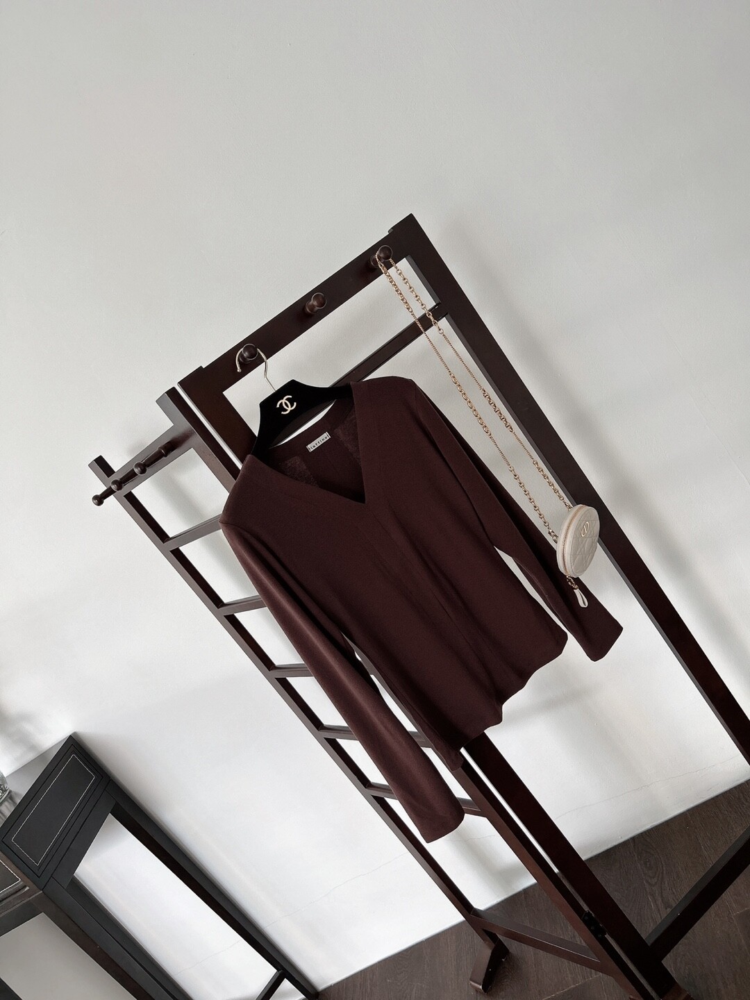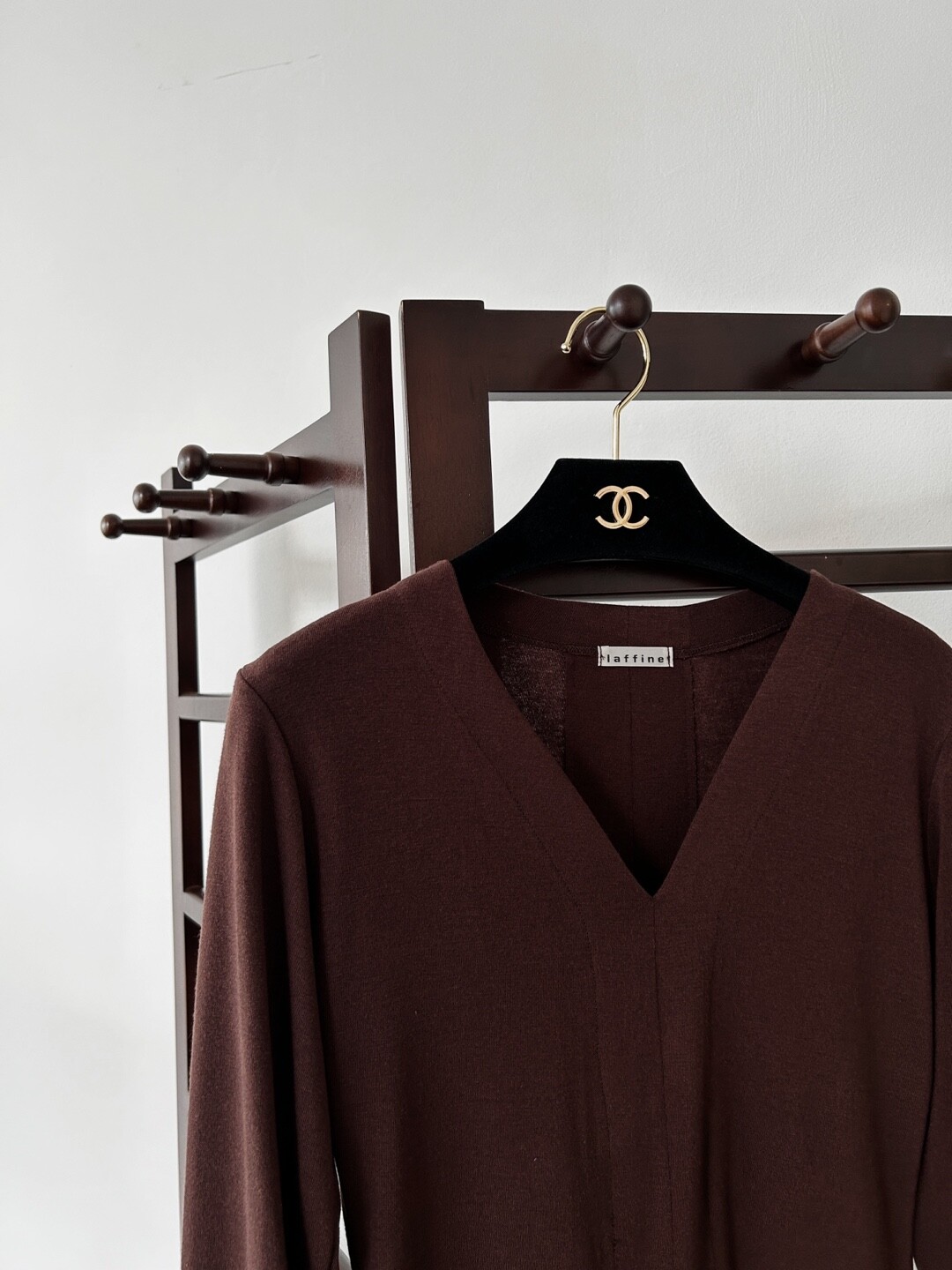 적당한 파임의 브이 패턴의 넥라인으로 여성스럽고 작고 갸름한 얼굴형으로 보일 수 있는 디자인입니다.