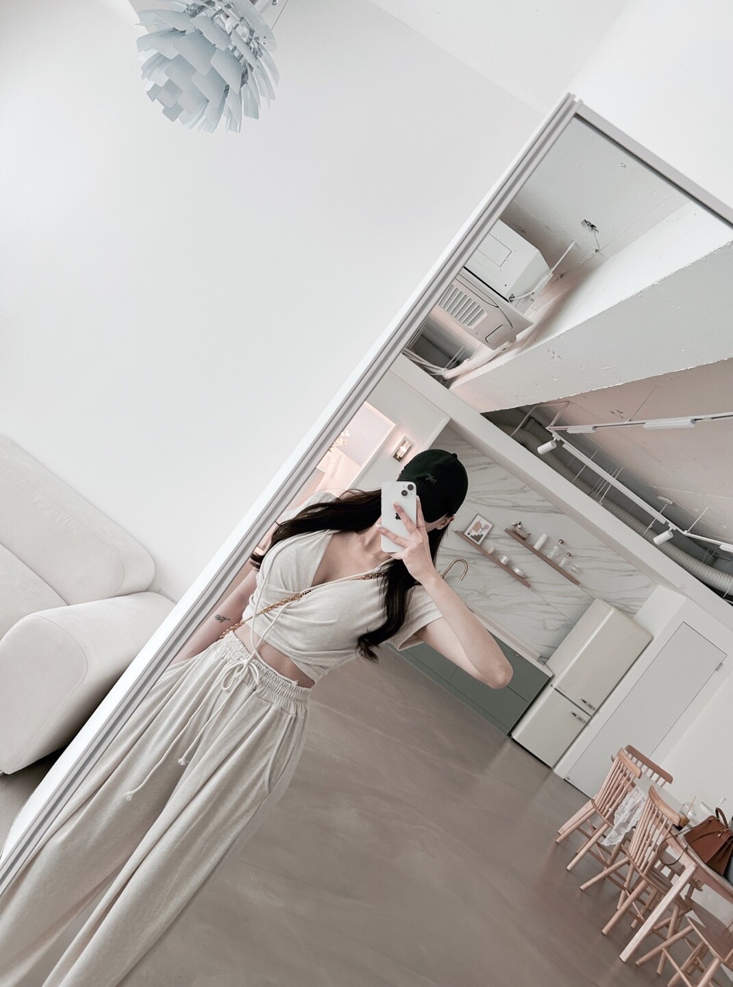 와이드한 핏감의 팬츠가 레그라인 보정을 도와주는건 물론 기장감이 애매하지않고 롱하여
