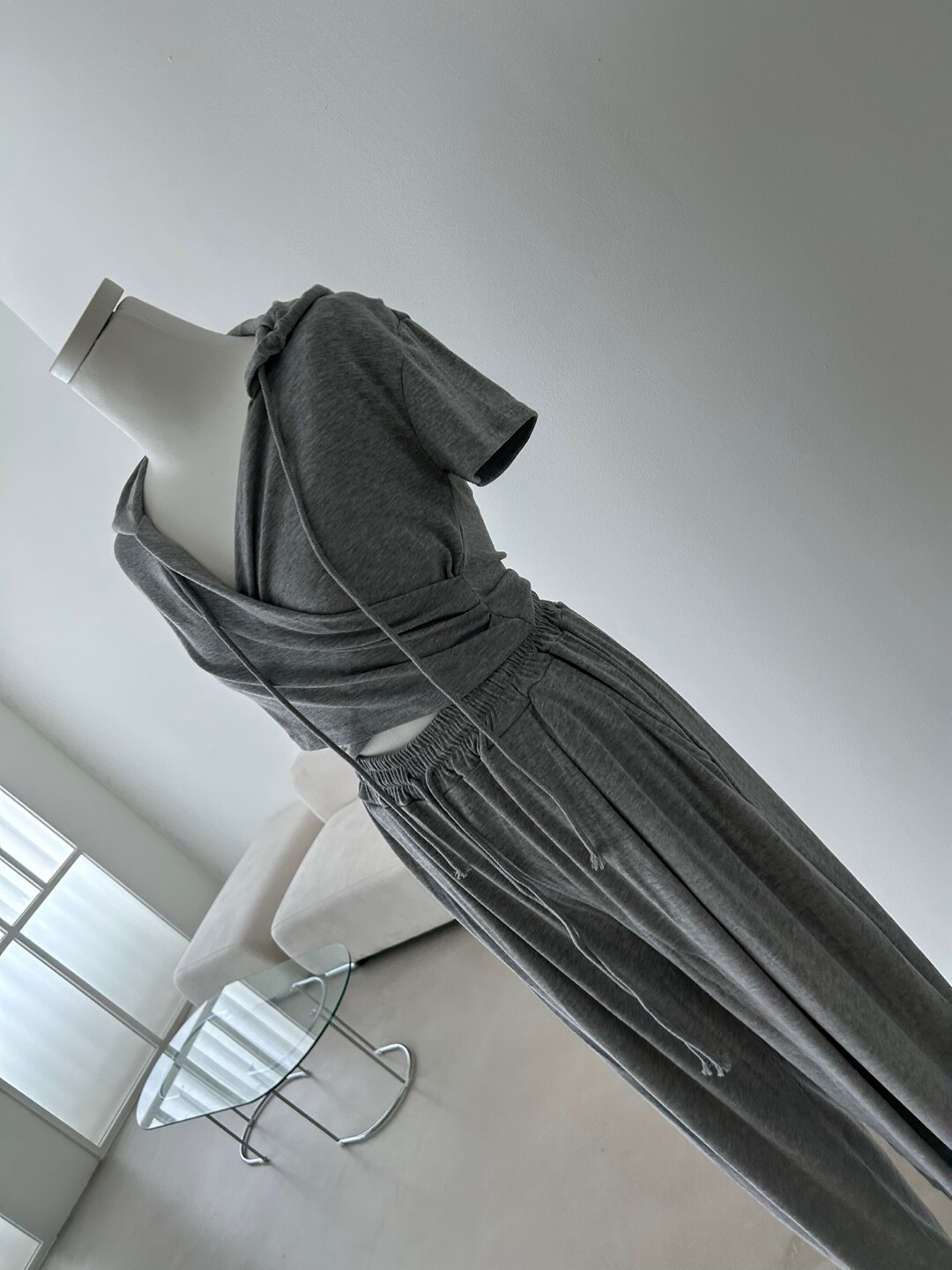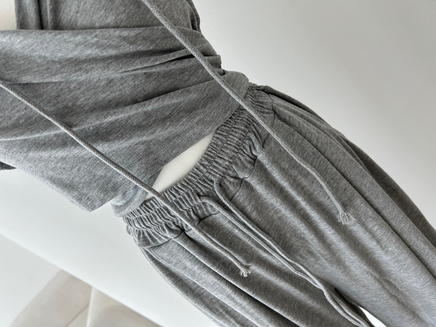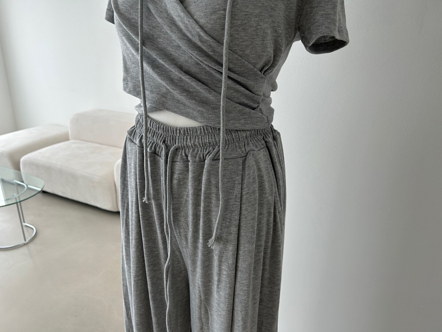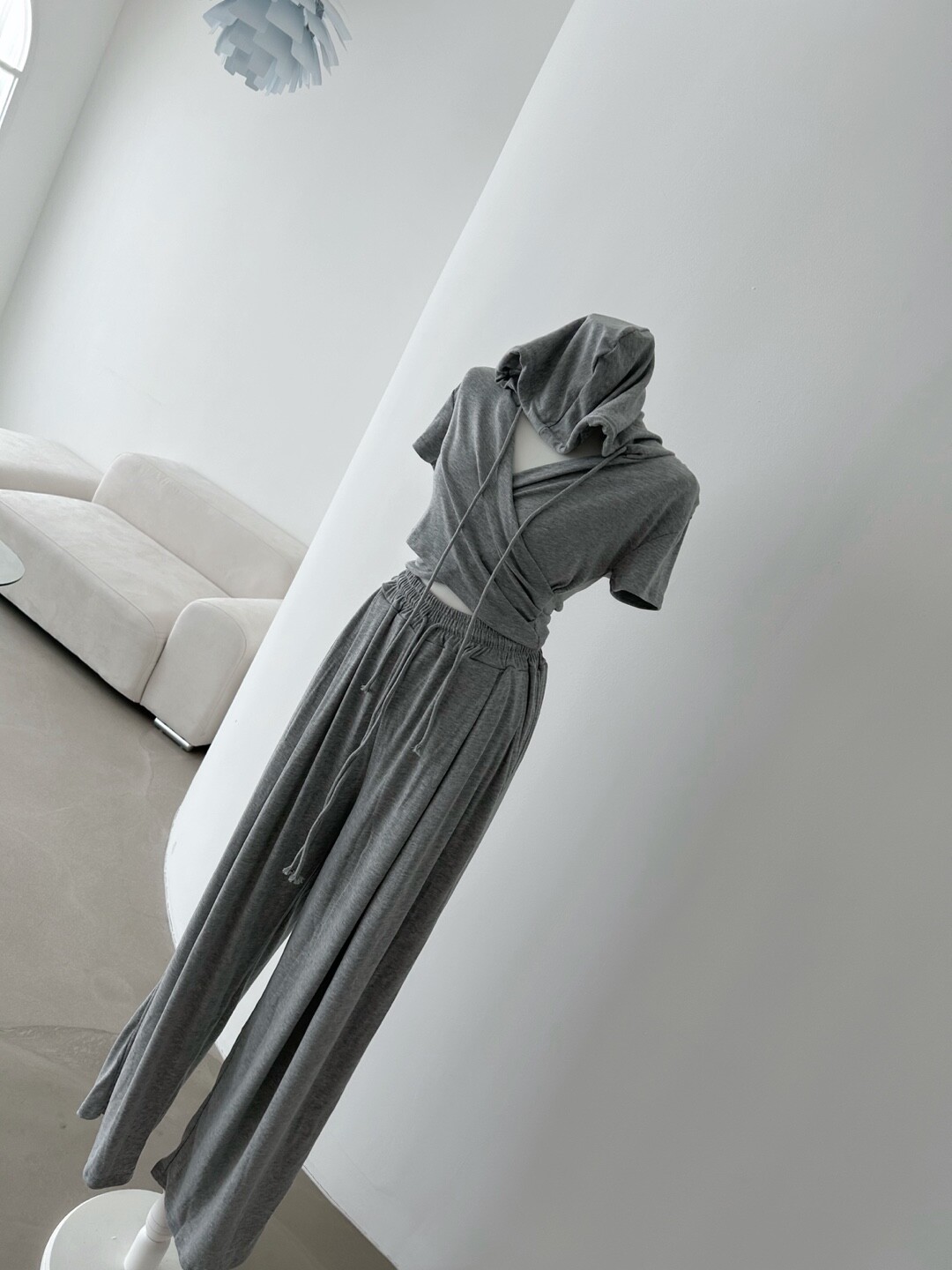 랩 디자인의 후드로 여성스러우면서도 캐주얼하게 착용이 가능한 만능 꾸안꾸 트레이닝 세트입니다.