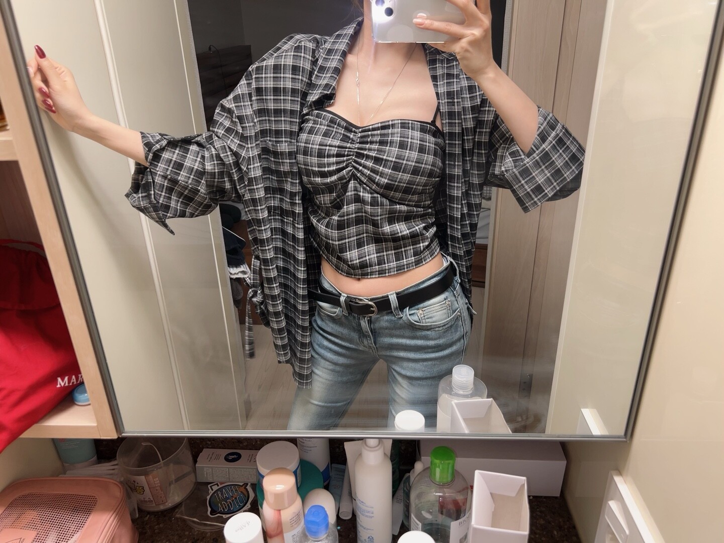 -탑과 오버핏 셔츠 세트 제품입니다.