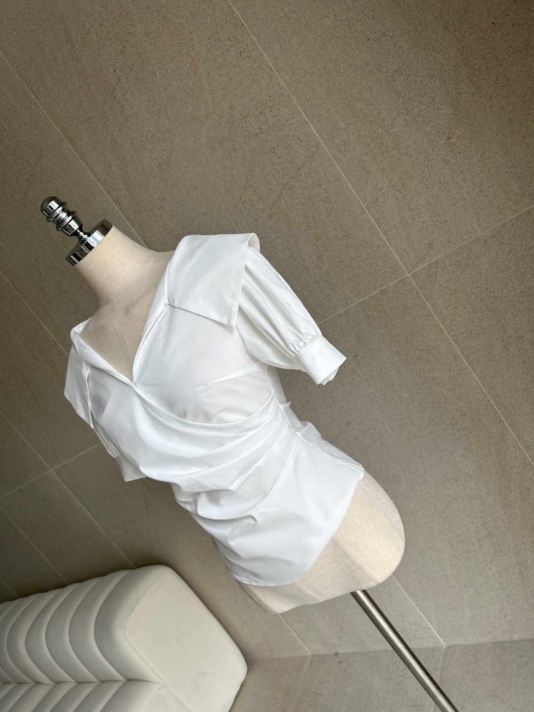 -빅 카라 제품으로 쇄골라인과 어깨 선을 돋보여 주며, 사이드 셔링과 랩 디자인으로 허리까지 잘록해 보이는 제품이에요.