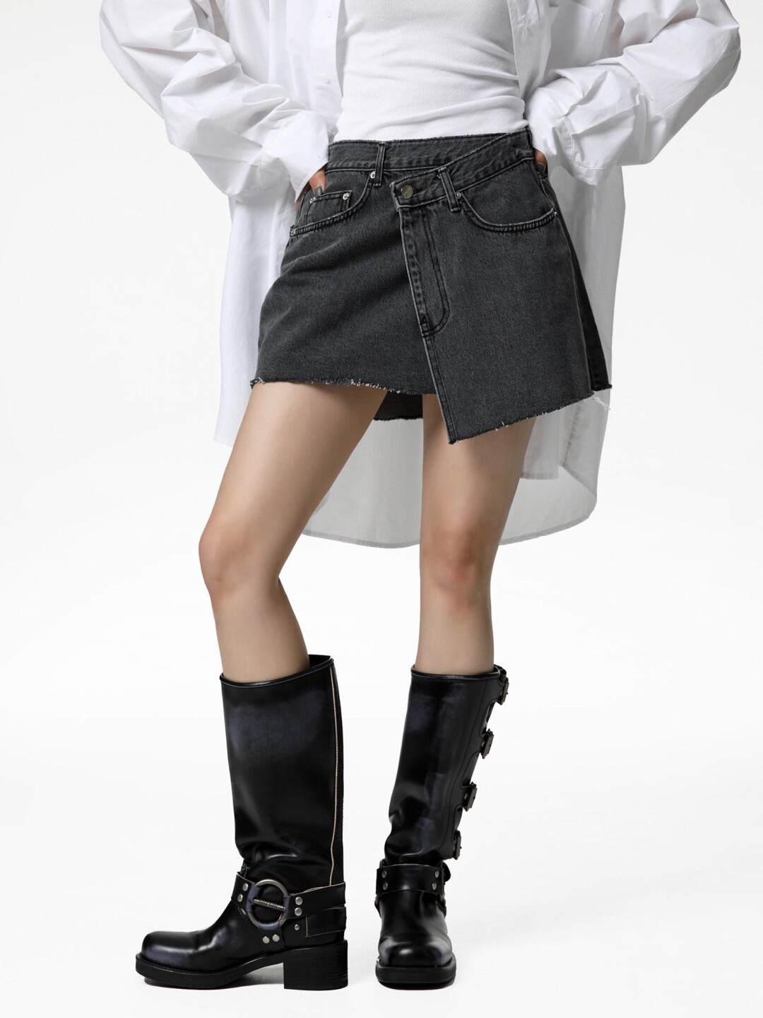 (high quality) unbalanced wrap detail denim mini SK 언발 랩 흑청 스커트
