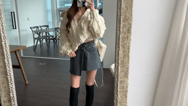랩스타일의 스커트로 감싸 착용하며 자연스럽게 연출되는 레이어링이 포인트가 되는 데님 소재의 미니 스커트에요.