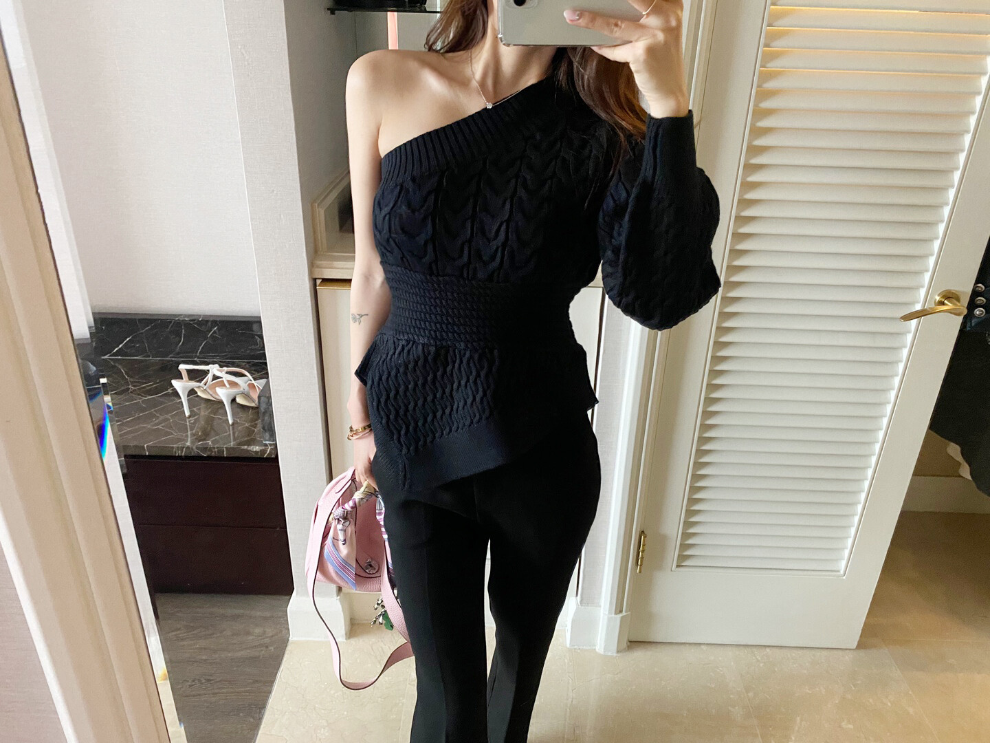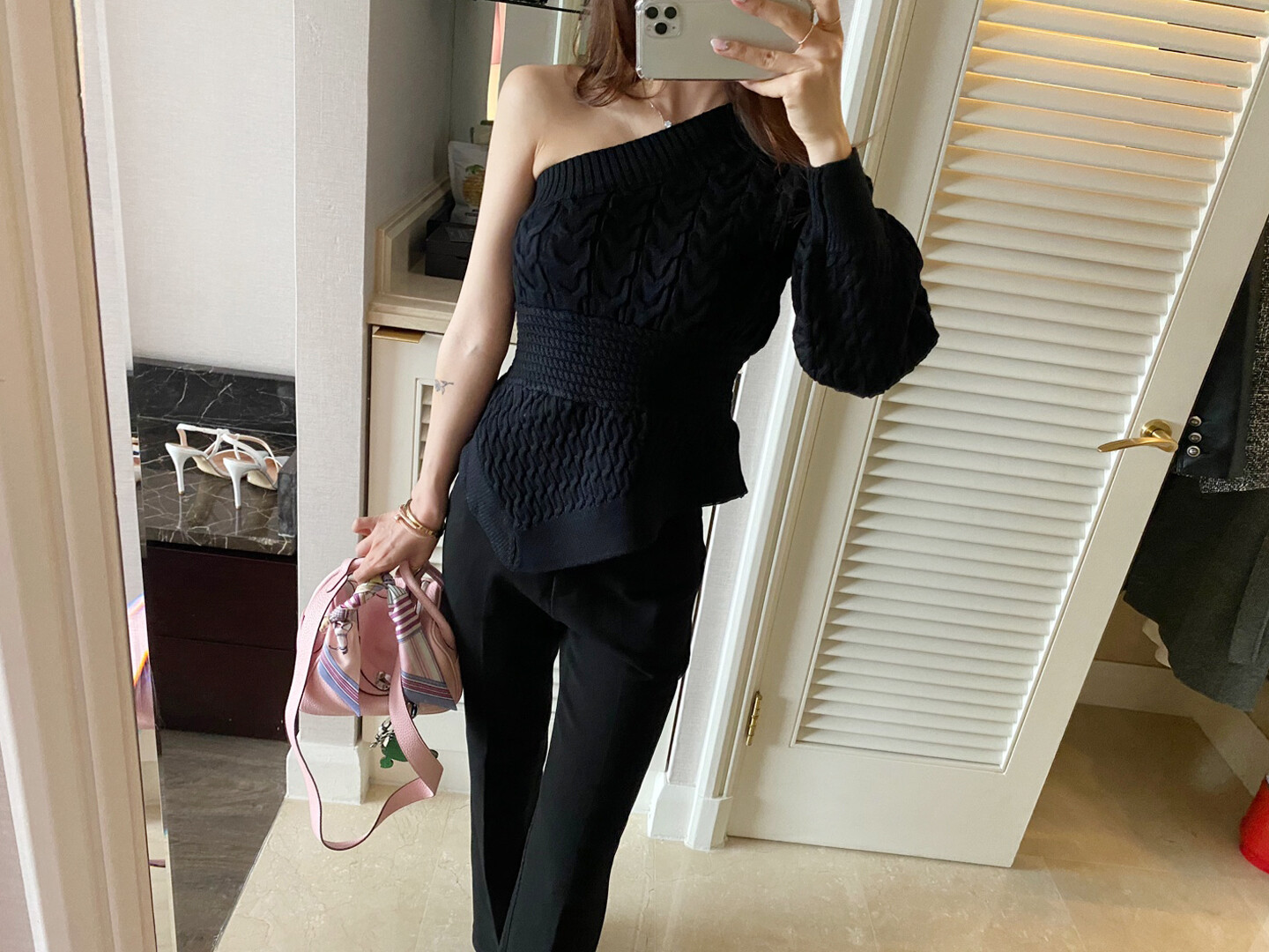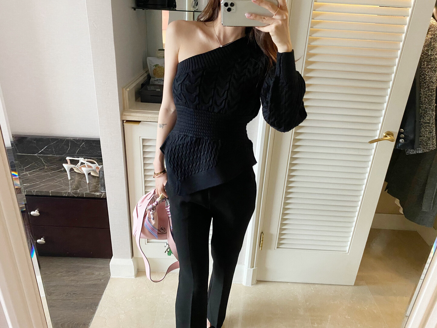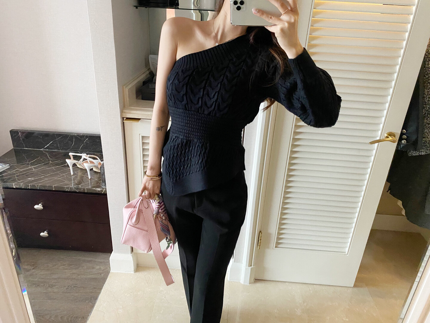 시크한 무드의 원숄더 니트 입니다