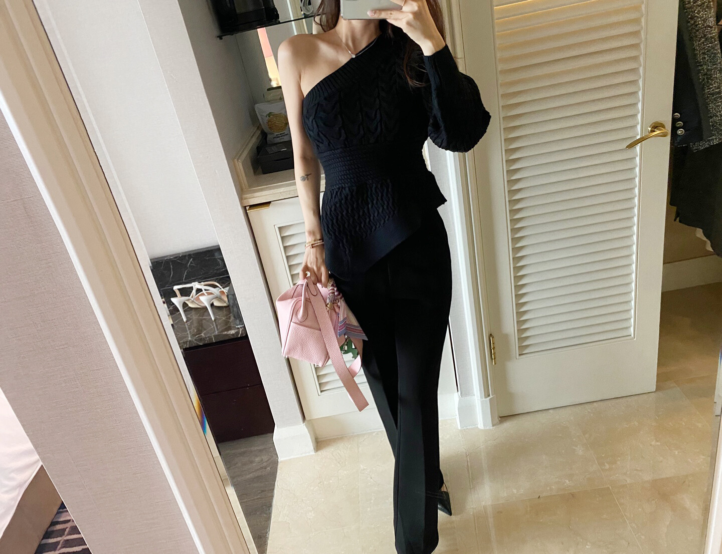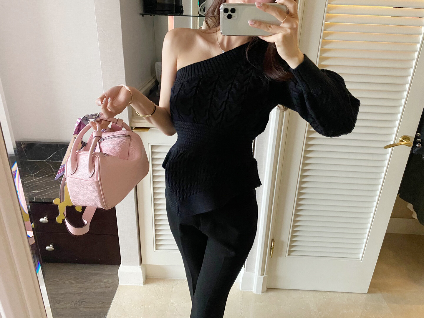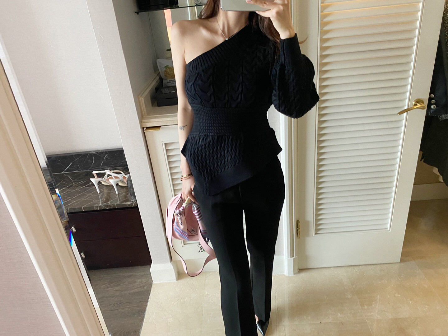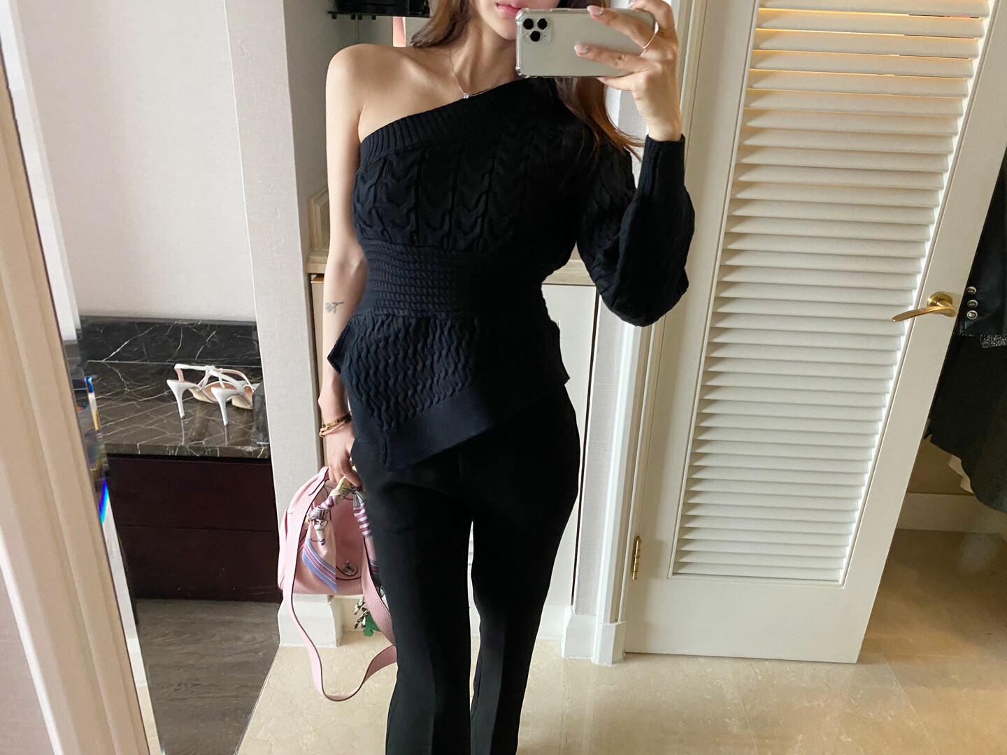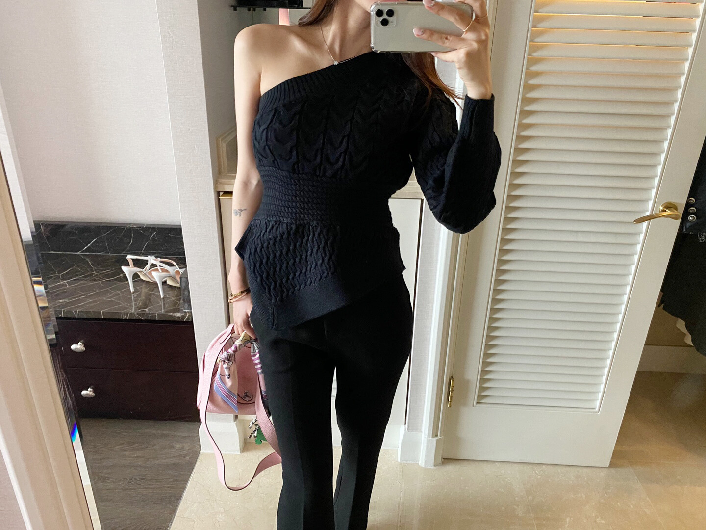 시크한 무드의 원숄더 니트 입니다