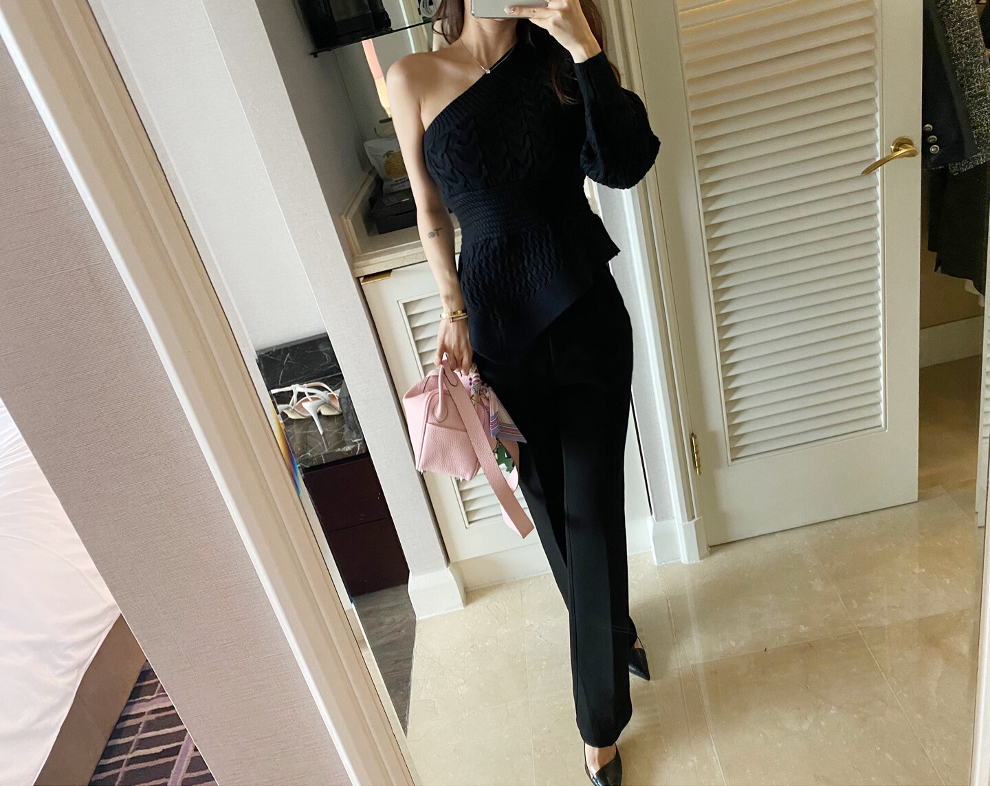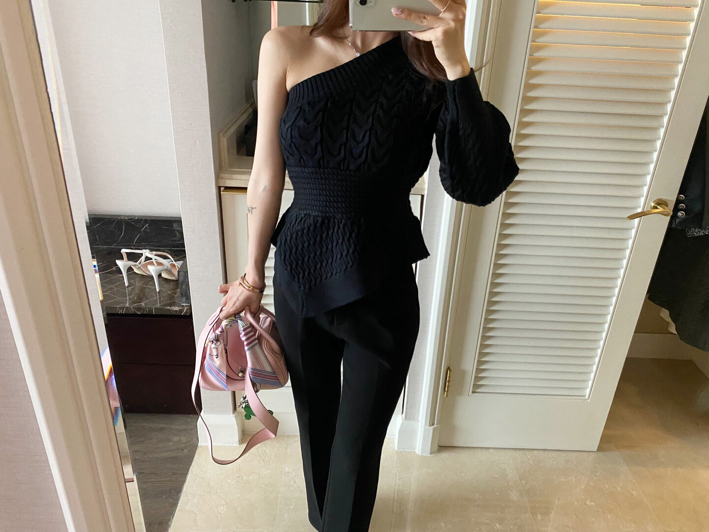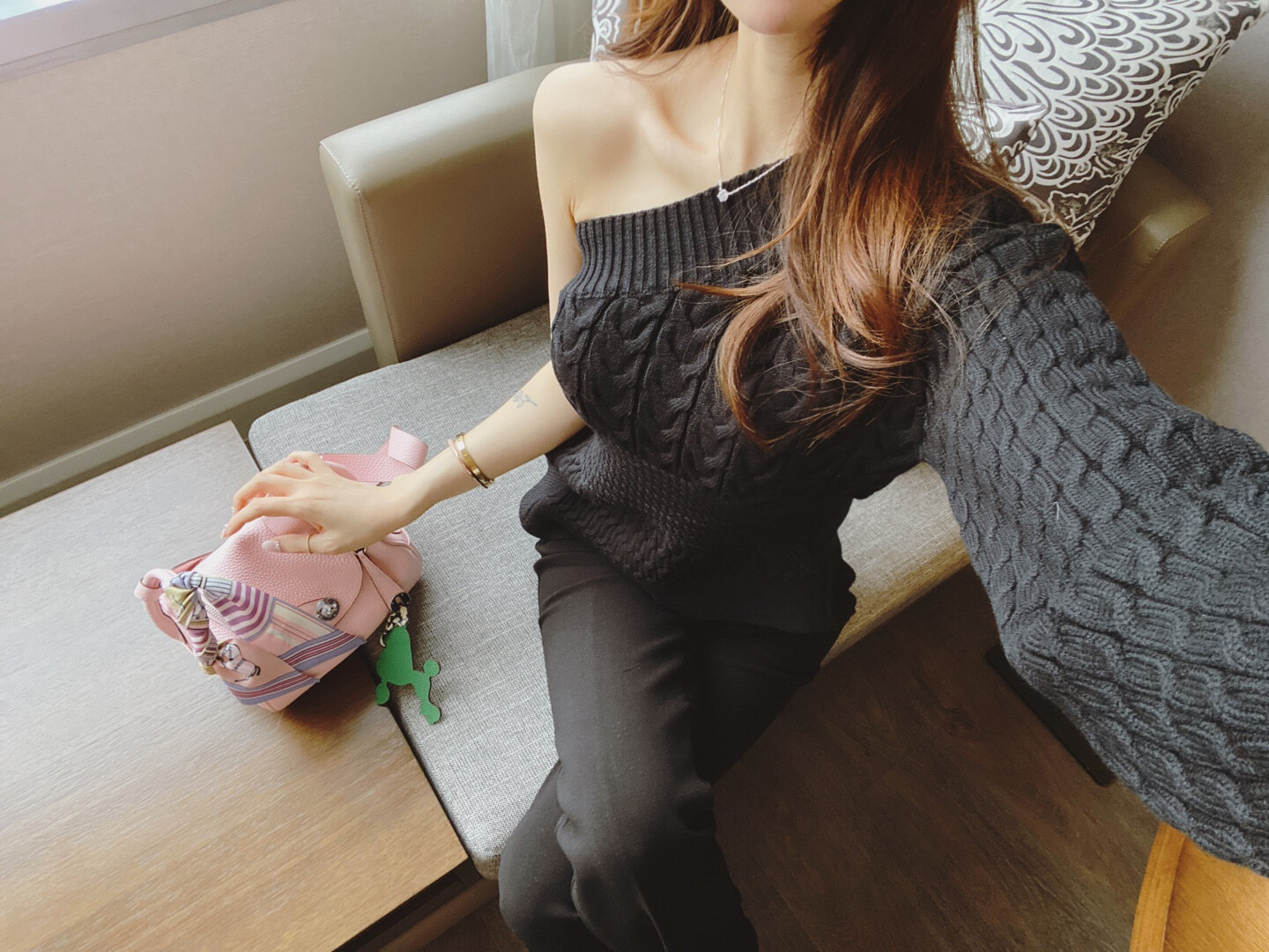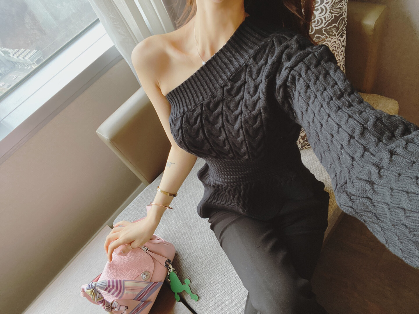 시크한 무드의 원숄더 니트 입니다